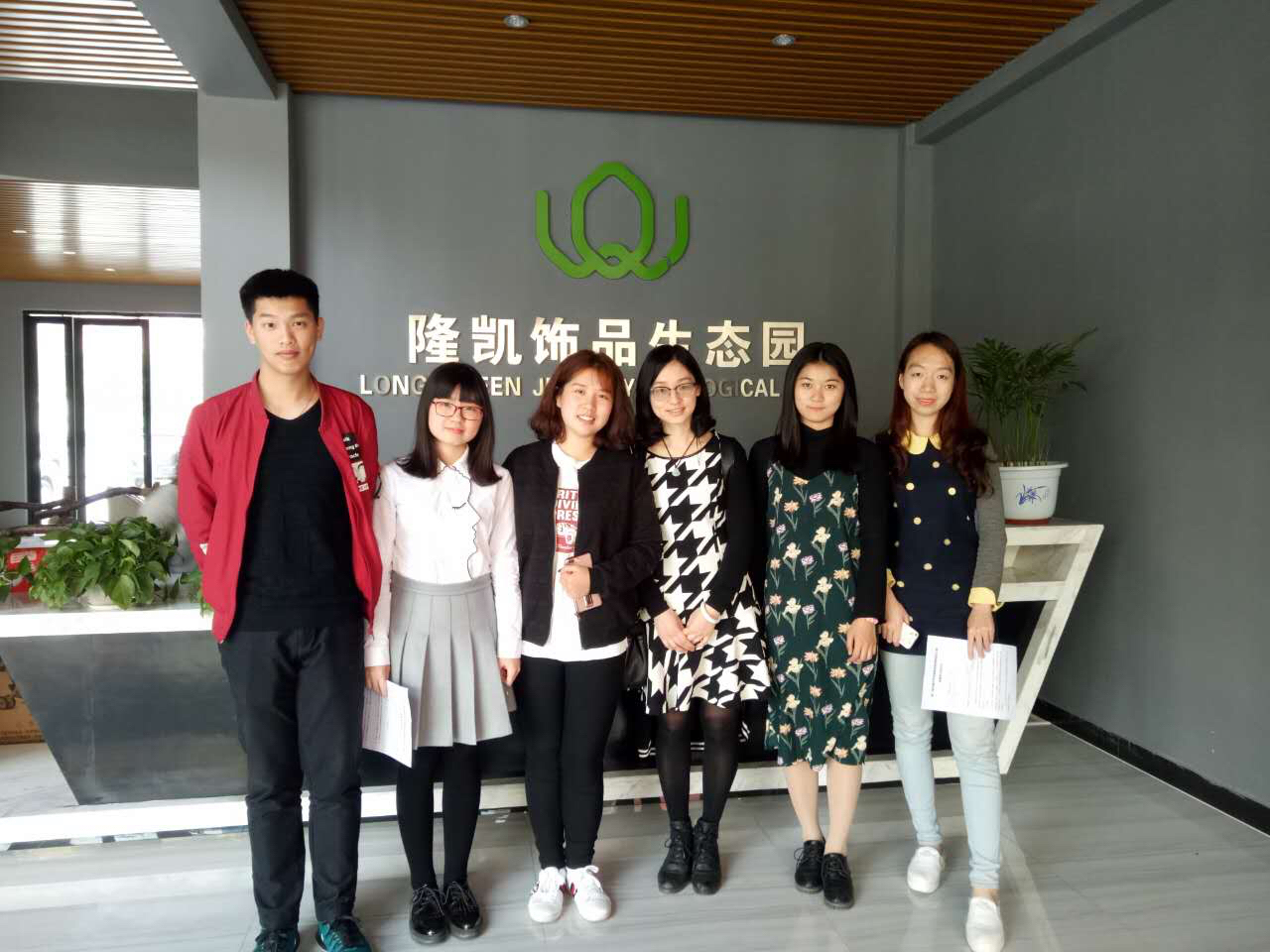 2017年3月3日,“玖羚后战队”成员在指导老师廖倩老师的带领下来到位于隆凯饰品生态园的隆凯公司进行参观、洽谈以及签署学生实训协议。隆凯饰品生态园集设计、采购、生产、销售、管理于一体,是全国最大的不锈钢饰品生产基地。我院师生队伍在跨境业务负责人肖凯总经理的热忱欢迎下,签署了学生实训协议,并在公司工作人员的带领下参观公司样品展示厅,观摩生产车间。能够深入企业参观、了解一线行情,这让学生们直呼“大开眼界”。