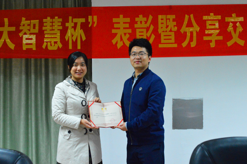 接着,表彰大会进入第二项议程,由学院团委副书记代亮老师、经贸系团总支副书记张志芳老师以及“大智慧杯”竞赛指导老师代表王艳娜老师为获奖学生颁发奖状,由代亮老师为指导老师颁发聘书。