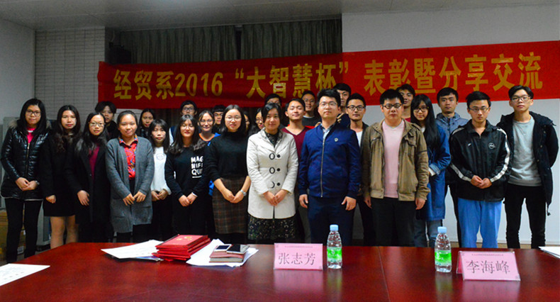 11月24日晚,中山大学新华学院经济与贸易系2016“大智慧杯”表彰暨分享交流会在东莞校区召开。学院团委副书记代亮老师,经贸系办公室副主任、团总支书记李海峰老师,经贸系团总支副书记张志芳老师及“大智慧杯”竞赛指导老师代表王艳娜老师出席此次会议。会议由李海峰老师主持。