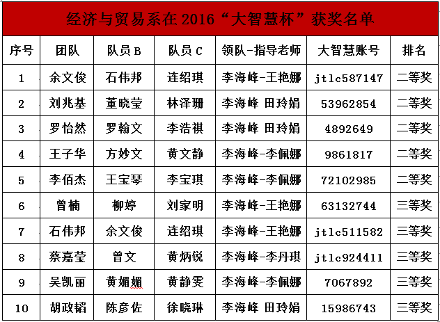 据悉,为响应党中央、国务院“大众创业,万众创新”的号召,推动青年学生“金融创业梦”的计划,搭建金融界产学研交流合作平台,我系由李海峰老师领队,由王艳娜、田玲娟、张玉春、徐永金、李佩娜、李丹琪6位老师组成指导教师团队,于2016年3月积极组织学生报名参加了由团中央学校部、全国学联秘书处联合举办的全国大学生第三届“大智慧杯”金融精英挑战赛,经过激烈角逐,最终取得优异成绩。本次大赛我系共有10支队伍30名学生获奖,其中,余文俊、刘兆基、罗怡然、王子华、李佰杰等15名同学荣获二等奖,曾楠、石伟邦、蔡嘉莹、吴凯丽、胡政韬等15名同学荣获三等奖。