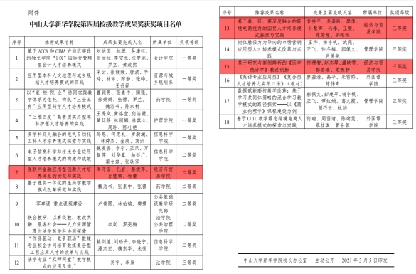为全面贯彻落实全国教育大会、新时代全国高等学校本科教育工作会议精神,全面对接国家“双万计划”“六卓越一拔尖”等本科人才培养计划,鼓励广大教师积极投身教育教学改革研究,总结并推广教学实践中的先进经验,推动加快高水平教育教学改革,加强学校内涵建设、提质量、创品牌、促发展,建设高水平、应用型、有特色的中大新华,根据《教学成果奖励条例》《广东省教学成果奖励办法》以及《中山大学新华学院院级教学成果评选奖励办法(暂行)》等有关规定,学校组织开展了第四届校级教学成果奖评选工作。