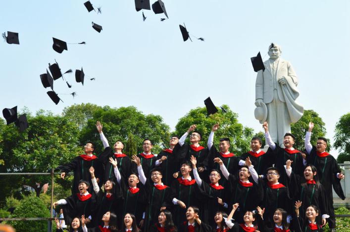 遵循工作人员的组织,毕业生们列队走上拍摄架,与领导老师合影留念。阳光正好,学士服微微拂动,将此刻笑靥如花的他们定格在照片里,将最美的大学时光留在新华。