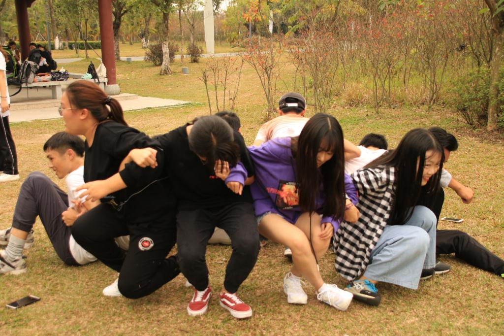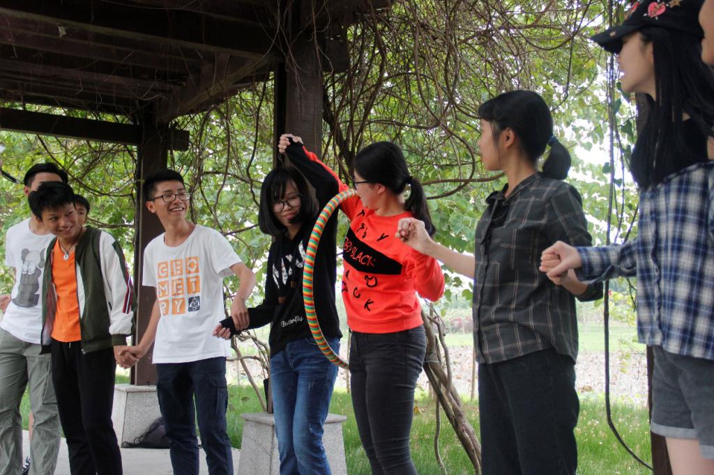 在华阳湖公园的栈道小亭里,队员们手拉手,相互指导协作,让“舞动的呼啦圈”从队伍左边穿越到队伍右边;在栈道对面的凉亭,队员们背靠着背,团结扶助,凭借团队整体强大的力量站立起来;在栈道对面的飘台中,队员们积极朗诵趣味绕口令,“牛奶奶找刘奶奶买牛奶”;钓鱼台上,“瞎子”在“瘸子”的准确指导下,踩爆一个个气球;腾龙阁顶层,队员们排队和和裁判们“对着干”,做出和裁判指令相反的动作;最后,各个队伍返回集合点,以“倒跑接力”争分夺秒追逐比赛的胜利,完成游戏中最后一次合作……队员们的笑声回荡在水湖林地。
