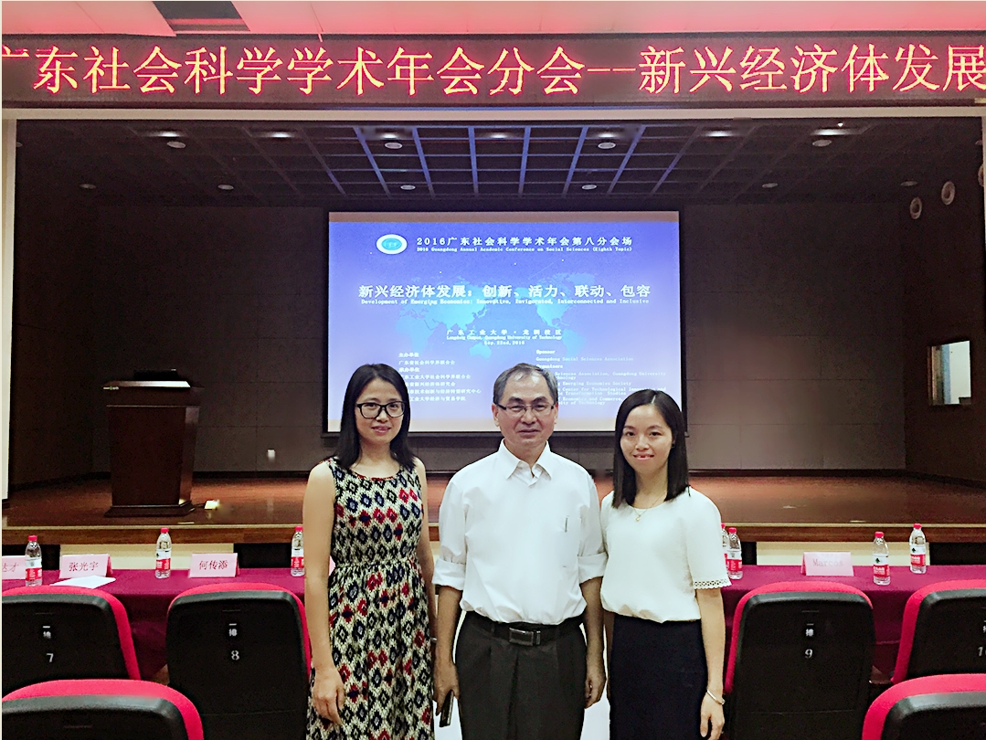 2016年9月22日下午,由广东省社会科学界联合会主办,广东省新兴经济体研究会和广东工业大学承办的2016广东社会科学学术年会第八分会场在广东工业大学龙洞校区行政楼讲学厅举行,经济与贸易系国际经济与贸易专业副主任吴喜龄,经济学专业副主任张才华老师应邀参加本次年会。