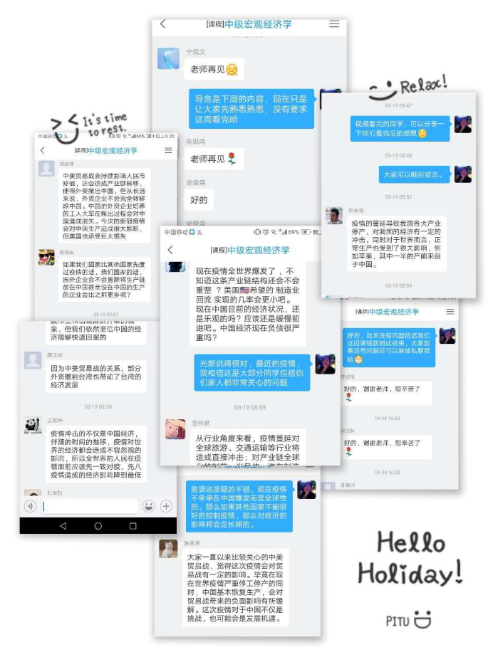 线上教学,虽然与学生们隔着一个屏幕的距离,你看不到他们的脸,他们也不一定看得到你的脸,但是我们之间的师生情好像并不会因为这个屏幕而阻隔断:在直播课上满45分钟后,我会给学生放《眼保健操》,提醒同学们休息一下眼睛,看看远方;在课程到精彩的地方,学生们会不吝啬的在讨论区、对话框给你献花,我可以借此知道学生确实是听懂了;在群聊里,学生会积极的讨论你抛给他们的讨论题,有什么说什么,毫不忌讳,畅所欲言;下课时,学生会在群里对你说“老师辛苦了,老师再见”。