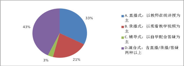 网络教学课程采取的教学模式,学生更倾向于直播/录播/答疑两种以上的混合式,占43%;其次是以教师在线讲授为主的直播式,占33%。