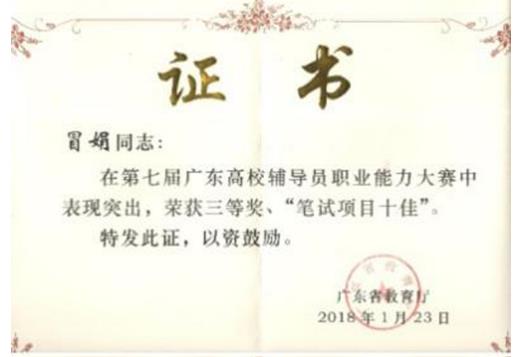 1月24日,广东省教育厅下发了《关于公布第七届广东高校辅导员职业能力大赛结果的通知》(粤教思函〔2018〕6号),我院冒娟老师为学校首次取得全省“笔试项目十佳”单项奖的佳绩,并荣获三等奖。