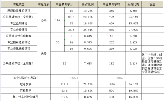 毕业总学分156学分,其中理论教学111.9学分,实践教学30.6学分,集中性实践教学环节13.5学分。实验实践教学占总学分28.27%。