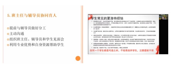 主题四:学生工作那些事儿。该期特邀我院学生工作办公室黄燕娟副主任和关琴老师担任主讲嘉宾,她们介绍了学生工作的详情与宝贵经验,鼓励青年教师在精通专业知识的同时,还要心系学生的思想、生活和健康,为学生的成长和发展保驾护航。