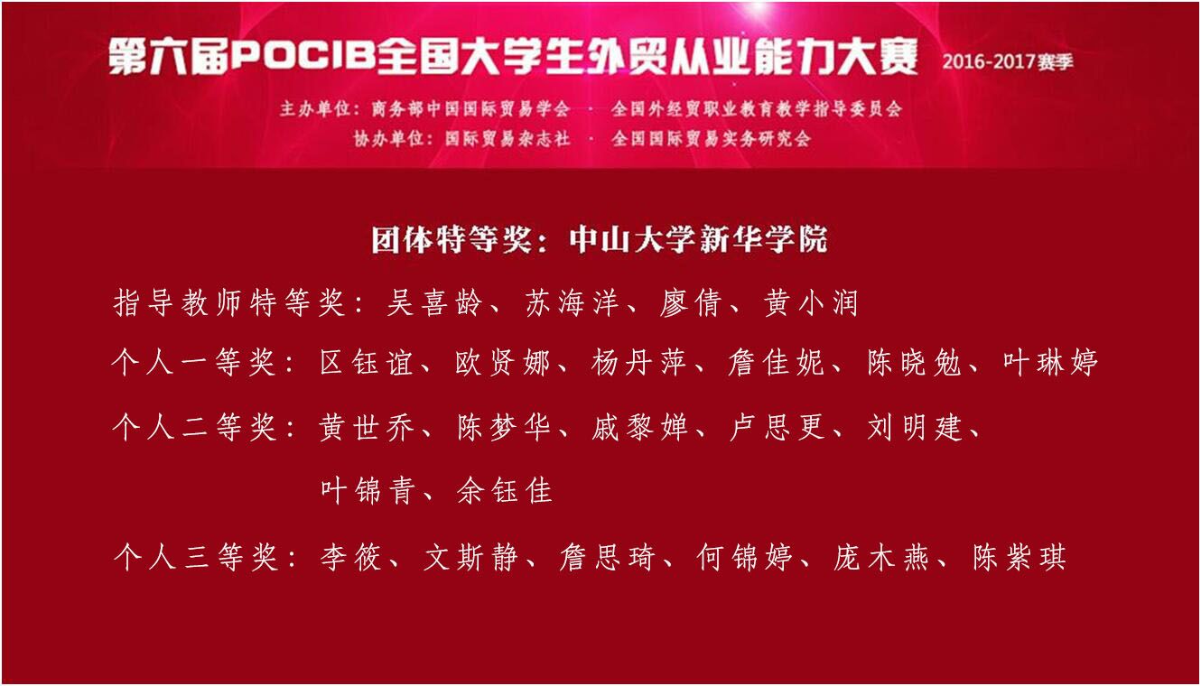 第六届POCIB全国大学生外贸从业能力大赛2016-2017秋季赛历经二十天,于11月29日落下帷幕。来自全国各地共160所本科院校,178支参赛队伍,3560名学生同场竞技参与。中山大学新华学院由2014级国际经济与贸易专业20名同学组成的参赛团队在多所211重点高校中脱颖而出,获得团队特等奖(赛事最高奖项),并获个人一等奖6项,二等奖7项,三等奖6项。经贸系国贸专业副主任吴喜龄,国贸专业教师苏海洋、廖倩以及辅导员黄小润四位老师分别获得指导教师特等奖。此次参赛,我院所获奖项数在参赛高校中居于前列,在此向获奖师生表示热烈祝贺,为他们感到骄傲和自豪。