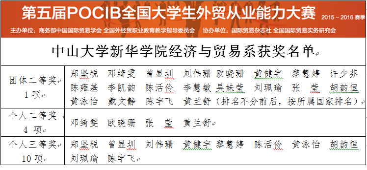 2016年4月27日,历时20天的第五届POCIB全国大学生外贸从业能力大赛(以下简称POCIB大赛)春季赛落下帷幕。由我院经贸系吴喜龄、苏海洋等老师和2013级国际经济与贸易专业20名同学组成的中大新华学院代表队一举斩获全国团体二等奖1项,指导老师个人二等奖2项(吴喜龄,苏海洋),个人二等奖4项(邓绮雯等),个人三等奖10项(郑坚锐等),共计17项大奖,成绩斐然。这是经贸系继第五届POCIB秋季赛狂揽19枚大奖后的再创佳绩。