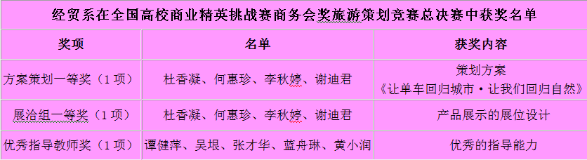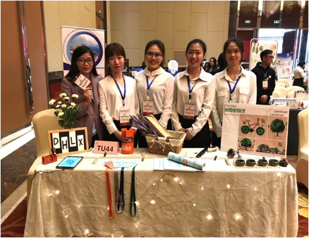 经济学会展方向的杜香凝、何惠珍、李秋婷和谢迪君四位同学组成的“DHLX团队”,凭借扎实的专业知识、灵活的到答辩能力以及充分的赛前准备,在总决赛现场陈述及答辩环节中得到了在场评委的一致认可,并以主题为“让单车回归城市·让我们回归自然”的《北京摩拜科技有限公司会奖旅游策划方案》荣获了本科组方案策划一等奖;同时,作品展示台的展位设计,配合茶艺、特色胸牌、主题手绘海报和“摩拜生花”等一系列物件以及平板电子展示,紧密衬托策划主题,博得评委老师的青睐,荣获展洽组一等奖。最后,谭健萍、吴垠、张才华、蓝舟琳和黄小润五位老师,分别荣获“优秀指导教师奖”,成绩喜人。