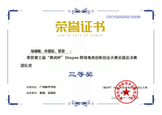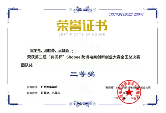11月8日,第三届“典阅杯”Shopee跨境电商创新创业大赛决赛如期举行,经过校内选拔赛、华南赛区区域赛的层层竞技选拔,我校2支队伍获全国赛三等奖,2支队伍获华南区域赛二等奖,3支队伍获华南区域赛三等奖。