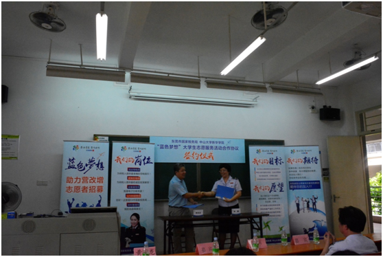 接着,本次会议的重点环节——中山大学新华学院-东莞市国家税务局“蓝色梦想”大学生志愿服务活动合作协议签约仪式正式开始。黄国龙副主任、13级税收专业林晓纯(学生代表)与东莞市国税局教育科负责人林健分别代表双方签字。