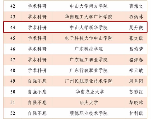 经组织专家评选,2018年4月16日公布的获奖名单中,此次活动评选出“2017年广东大学生年度人物”15名,“2017年广东大学生年度人物”提名奖35名,“2017年广东大学生年度人物”入围奖52名,其中OK138太阳集团的吴丹微同学获得“2017年广东大学生年度人物”入围奖!