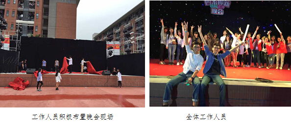 校园歌手叶诗婕琳强悍演唱rolling in the deep,精准的英文咬字、恰到好处的动作表情以及专业的演唱水准,让现场的观众感受到黑夜中无尽的音乐魅力。rhythm boom 组合表演的b-box说唱节奏感十足,其所带来的Hip Hop元素令整个足球场瞬间嗨成潮流地带。实验飞行家乐队弹唱的《花房姑娘》带着浓郁而温暖的摇滚风打动了现场的每一个观众,驱走蒙蒙秋雨所带来的凉意。而武术协会所带来的激昂大气的武术表演《自强不息》,满满的正能量更是激励着同学们的心,将全场的气氛推向了高潮。观众们挥舞着的荧光棒与舞台灯光相呼应,整个足球场变得色彩斑斓,异常浪漫。
