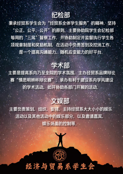 纪检部经贸许愿学生会分管纪律和检查的重要职能部门,主要是协助院学生会纪检部每周的“三风”督察工作,并协助制定并监督执行学生各项规章制度和奖励机制,在活动中负责签到及控场工作,是一个提高沟通能力、随机应变能力、表达能力以及展示自我的好平台。经贸学院学生会纪检部全体成员秉承经贸学院学生会为“经贸学院全体学生服务”的精神,坚持“公正、公平、公开”的原则,有着团结友好、乐观阔达等精神。