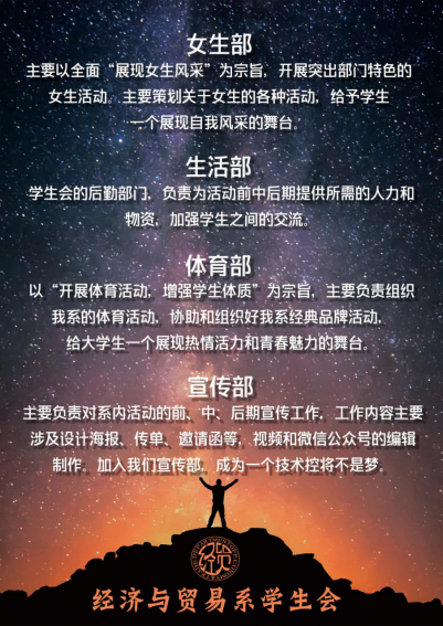 寄语:经贸学院学生会是一个有行动力有创造力的组织,也是一个有凝聚力有协作力的大家庭。新学期新动力,贸贸将贯彻服务学生的宗旨,继往开来,做广大学生先进思想方向的引路人,推进校园文化建设的主力军,维护全校学生合法权益的代言人。这里责任与荣誉共存,汗水与欢声同行,愿共你携手相约下一个十年。