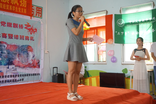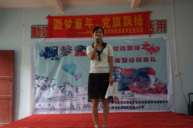 高州市团委副书记裴婉君、鹤山小学校长卢绍荣等领导应邀出席典礼现场。中山大学新华学院经贸系黄小润老师代表“星辉服务队”发言,她简要介绍了“星辉服务队”本次社会实践活动的基本概况,活动的宗旨和目的,也表扬了队伍在鹤山小学支教过程中达到了让“校长放心、家长安心、学生开心”的效果,同时感谢鹤山小学全体师生对我们活动的支持和配合。