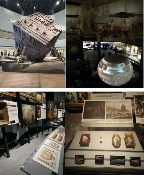 紧接着,参观队伍来到威远炮台旧址附近的海战博物馆进行参观,该馆坐落在珠江入海口东岸虎门威远炮台旧址旁,馆区有陈列楼、宣誓广场、观海长提等组成建筑纪念群体。来到博物馆门口,首先映入眼帘的是由前国家主席江泽民同志亲笔题写的馆名。海战博物馆主要有鸦片战争海战陈列馆、《虎门海战》半景画馆,以鸦片战争时期中英军事力量的对比,讲述了中国军队英勇抗击英国侵略者的故事。进展厅看到的是一个巨大的雕塑,这个雕塑上面所有的符号都是代表跟鸦片战争相关的一些符号,比如1840、1842代表着第一次鸦片战争的时间节点;齿轮代表着英国的工业革命;而舰船和大炮则象征着英国的坚船利炮。