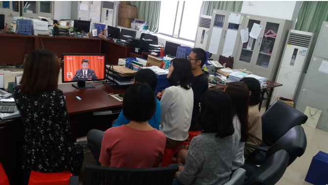 经贸学院党总支李海峰副书记和老师们在办公室一起收看十九大报告直播。他表示,我们要自觉学习党的十九大报告,深入领会习近平新时代中国特色社会主义思想的丰富内容和基本方略,贯彻落实党的十九大精神,不忘初心,立德树人,用伟大的中国梦激荡青春梦。“青年兴则国家兴,青年强则国家强。青年一代有理想、有本领、有担当,国家就有前途,民族就有希望。”我们更应引领好、服务好经贸学院学生,关心和爱护青年学子,为青年学子筑梦,做好新时代的学生引路人。