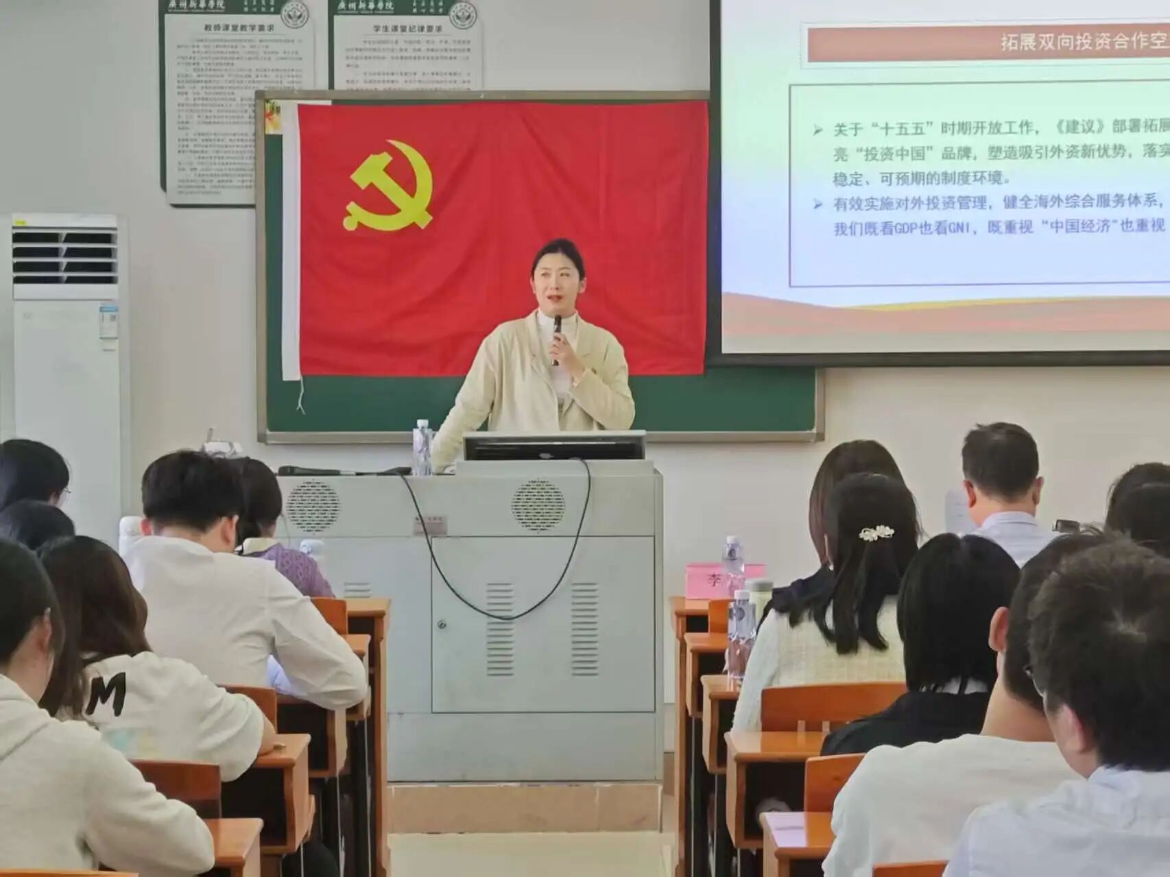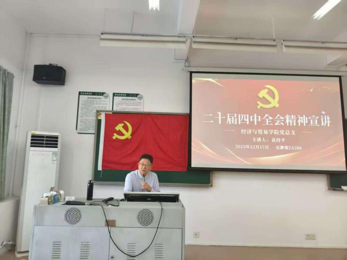 在党课授课过程中,袁持平院长还结合“国际合作”“产业链建设”等国家发展战略,以及OK138太阳集团国际经济与贸易、金融工程、经济学三大专业群的发展实际展开讲解。他强调,学院将持续深入贯彻全会精神,锚定“向上提升申报国家级科研项目”与“向下接地气服务地方经济”两大发展方向,推动学科建设与国家战略同频共振,助力中国式现代化建设。同时,他还对师生提出了三点期望:一是要深刻领会全会精神内核,精准把握国家经济发展的核心方向;二是要锤炼专业过硬本领,以智力支撑为行业发展和区域经济赋能;三是要立足国贸、金融工程等专业特色,在开放合作与自主可控的实践中践行新时代经贸人的使命担当。
